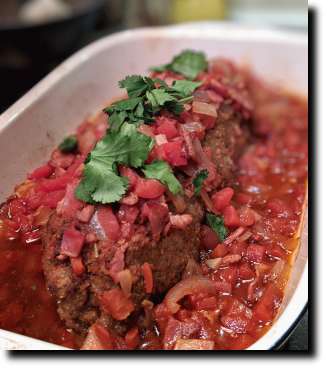 | 3. | Fry (D) in saucepan until crispy, remove bacon, chop and return to pan. Add (E) and fry until translucent, then add (F) and bring to a boil. Pour sauce over loaf, cover with foil, and bake 25 more minutes (internal temperature 150F). |